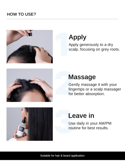 | How-to-Apply | Apply generously to a dry scalp, focusing on grey rootsGently massage it with your fingertips or a scalp massager for better absorption |