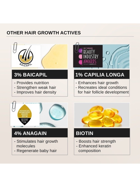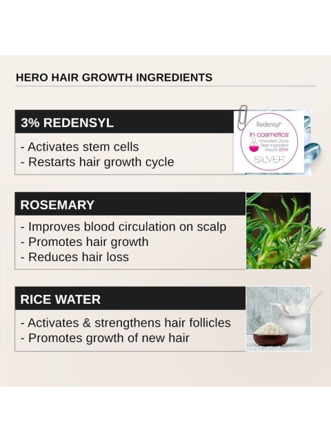 | Ingredients | RedensylActivates stem cellsRestarts hair growth cycleRosemaryImproves blood circulation on scalpPromotes hair growthReduces hair lossRice WaterActivates &, strengthens hair folliclesPromotes growth of new hairOther Ingredients: Anagain, Baicapil, Capilia Longa, Biotin |