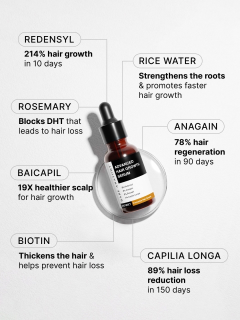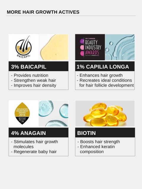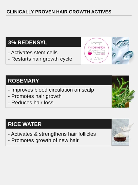 | Ingredients | 3% Redensyl + 4% Anagain + 3% Baicapil + 1% Capilia Longa, Rosemary, Biotin &Amp, Rice Extract |
