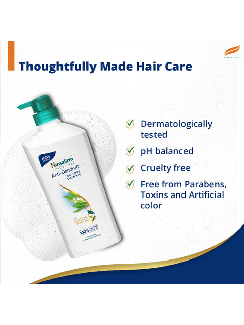 | Special Features | Himalaya Anti-Dandruff Tea Tree Shampoo is a breakthrough formulation using Plant Sciences, a special blend of selective botanical extracts and Natural Protein 5 Technology, that helps fight dandruff, soothes the scalp, and provides nourishment, making your hair healthy and beautiful.The new, improved Anti-Dandruff Tea Tree Shampoo, suitable for both women and men, is infused with the goodness of Tea Tree Oil and Aloe Vera, nourishing hair.Effective for all hair types.Safe to use on artificially colored or permed hair.Paraben free.pH balanced.Cruelty free.Dermatologically tested.For external use only.Store in a cool and dry place, away from direct heat and sunlight.Our dermatologically tested formula is fortified with herbal ingredients. |