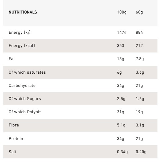 INGREDIENTS: Protein Blend (Calcium Caseinate (Milk), Whey Protein (Milk), Milk Protein), Milk Chocolate with Sweetener (20%) (Sweetener: Maltitol; Cocoa Butter, Whole Milk Powder, Cocoa Mass, Emulsifier: Soy Lecithin; Natural Flavouring), Bovine Collagen Hydrolysate, Sweeteners: Maltitol, Sucralose; Humectant: Glycerol; Bulking Agent: Polydextrose; Chocolate Chips with Sweetener (5.8%) (Cocoa Mass, Sweetener: Maltitol; Emulsifier: Soy Lecithin; Fat-reduced Cocoa Powder, Natural Flavouring), Soy Protein, Soy Oil, Sunflower Oil, Flavourings, Potassium Chloride, Emulsifier: Soy Lecithin.