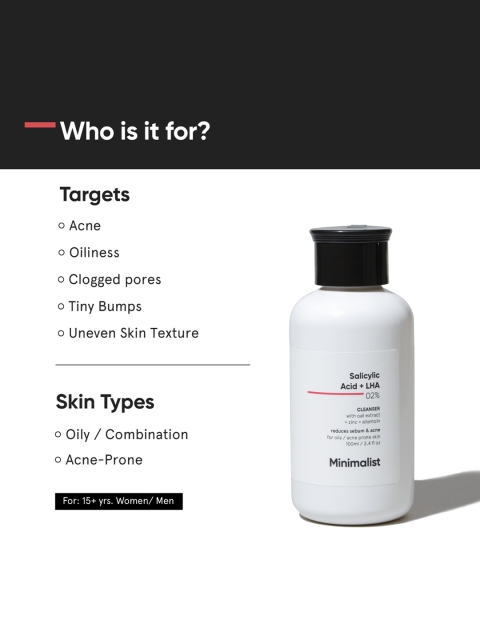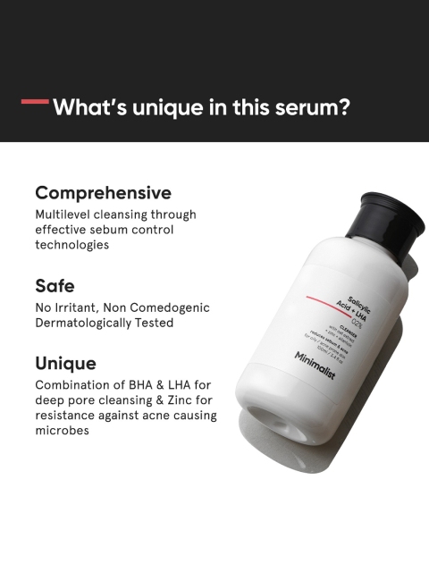 | Benefits | Multi-level cleansing: formulated with capryloyl salicylic acid (lha), which stays on outer layer of skin and provides gentle exfoliation, revealing soft skin, while salicylic acid penetrates deep into pores and reduces sebum and oil production.This salicylic acid and lha combination provides multi-level cleansing unlike other salicylic acid face wash.Sulphate-free, non drying: compared to traditional face wash this is formulated with very mild sulfate-free surfactants (cleansers) that provide optimum cleaning along with several hydrating &, soothing ingredients like panthenol (vitamin b5) for hydrating overall after-feel.Anti acne: boosted with anti-bacterial zinc and salicylic acid that effectively controls oil production and acts as a potent anti acne (or pimple) active.Reduces acne and prevents future breakout for clear-looking skin.Clean &, transparent beauty: formulated at ph 4.5 – 5.5 with high purity grade salicylic acid by merck, Germany a leading global supplier.For combination to oily skin type: unlike traditional facewash BHA exfoliant are best for combination to oily skin types especially acne-prone or sensitive skin. also, lha offers a gentle, cell-by-cell exfoliation without any irritation. formulated for both men and women.This Salicylci Acid + LHA based face clenaser prevents Acne, controls Oil &, reduces open pores by providing multi-level cleansing without drying out your skin. |