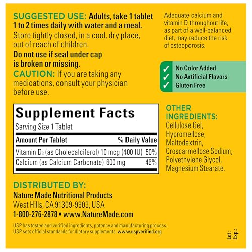 - Bone support Calcium supplement: contains one 220 count bottle of Nature Made Calcium 600 mg with Vitamin D3 Tablets