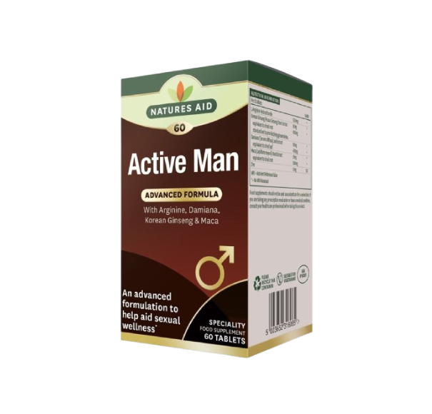 Natures Aid Active Man with Arginine, Damiana, Korean Ginseng and Maca is an advanced formulation to help aid sexual wellness. Also includes Zinc which contributes to normal fertility and reproduction and to the maintenance of normal testosterone levels in the blood.