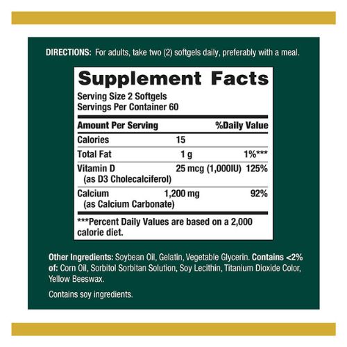- 1200 mg Calcium Plus 25 mcg (1,000 IU) Vitamin D3 Per Serving