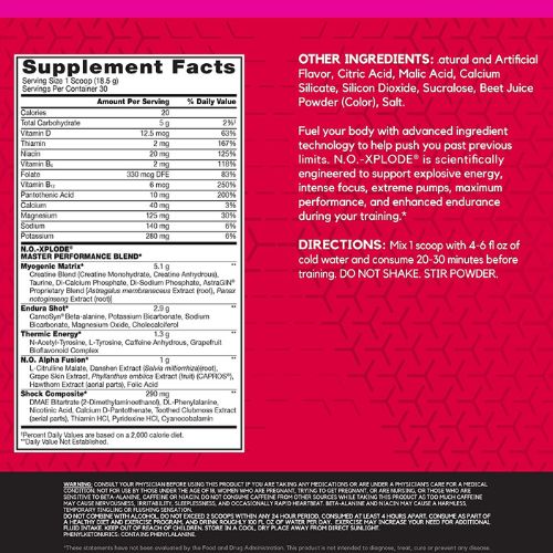 Ignite your training sessions with BSN NO-XPLODE, the legendary pre-workout designed to deliver explosive energy, insane pumps, and laser focus. Each scoop packs a scientifically formulated blend of caffeine, beta-alanine, and creatine to push your limits and maximize performance.